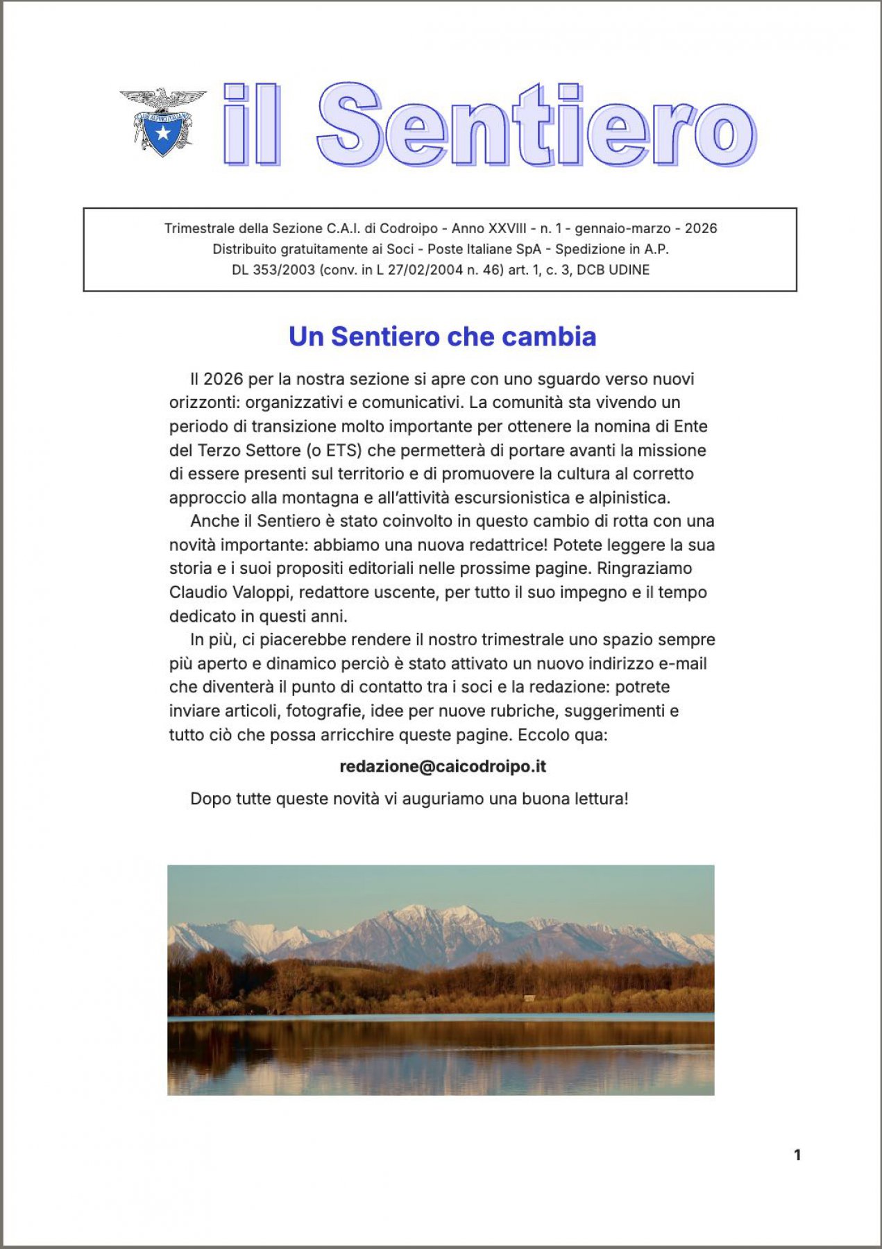 Il Sentiero racconta la vita della nostra Sezione: escursioni, storie di montagna e contributi dei soci. Con la nuova veste grafica e nuove rubriche, è diventato uno spazio ancora più ricco e partecipato.